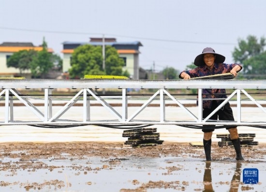4月20日,在彭山區(qū)公義鎮(zhèn)的數(shù)智水稻示范基地,工人在秧盤智能傳輸帶上轉(zhuǎn)運(yùn)育秧盤。