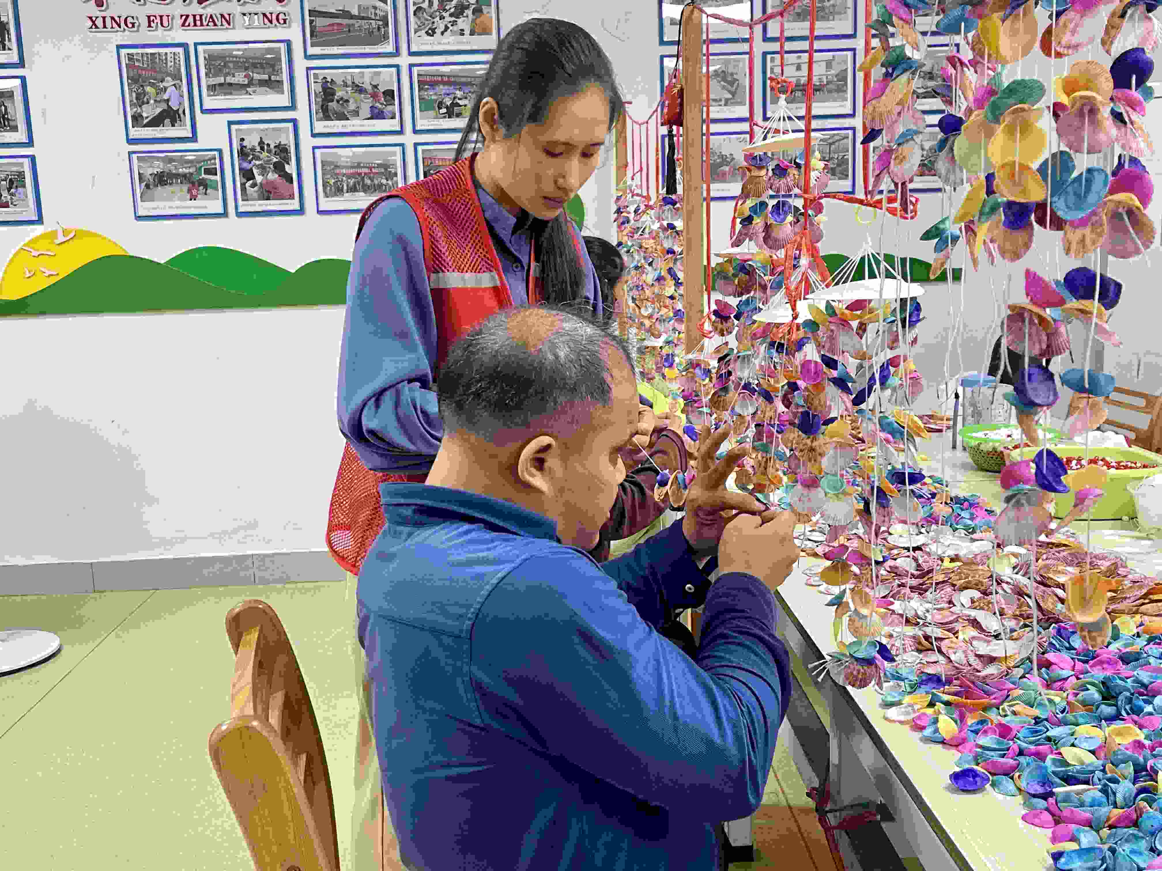 在北海市銀海區(qū)僑港殘疾人輔助性就業(yè)及日間照料中心(以下簡稱“中心”),工作人員在指導(dǎo)殘疾人串貝殼。這里已經(jīng)安置了11名殘疾人與企業(yè)簽訂勞動(dòng)合同,人均年收入在2萬元左右。