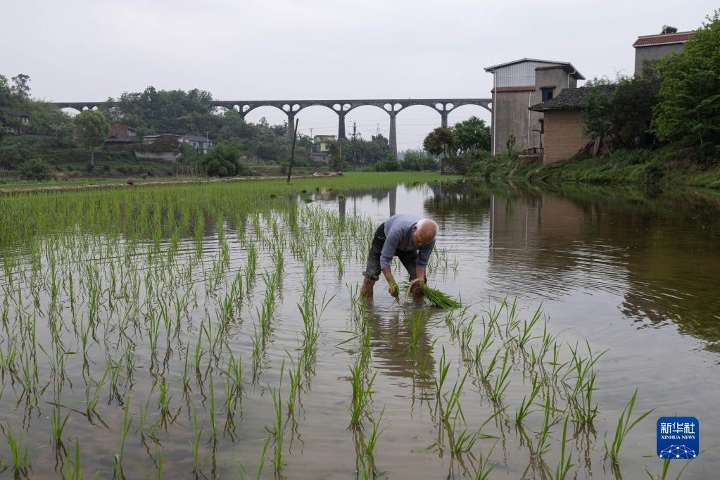 4月25日,在瀘縣奇峰鎮(zhèn)寶豐村,村民在寶藏渡槽附近的水田里插秧。