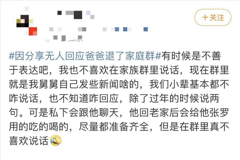 但張爸爸對家庭群的“冷清”同樣表示理解,“退群后,也有親戚私聊我進(jìn)行解釋,說實在是比較忙所以沒有回應(yīng)。現(xiàn)在大家的工作壓力比較大,同輩的親戚和孩子們工作都很忙,并且大家因為生活、工作、經(jīng)歷的不同造成漸行漸遠(yuǎn)”。