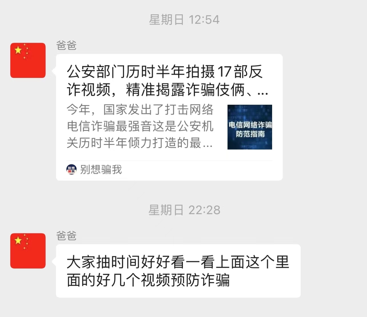 “在群里發(fā)了消息,我肯定會期待大家的回應(yīng),在我看來家庭群的意義就是如此。如果我真心地進(jìn)行分享卻沒有人回復(fù),心里肯定還是很失落的,更何況我們分享的內(nèi)容是比較有意義的?!鄙现苋諒埌职衷谌豪锓窒砹艘粍t“公安部門歷時半年拍攝17部反詐視頻,精準(zhǔn)揭露詐騙伎倆”的推文,并表示希望大家抽時間看一看視頻預(yù)防詐騙,而發(fā)完這條后卻一直沒有人回復(fù),“多次打開群聊卻發(fā)現(xiàn)無人回復(fù),我真的很傷心”,直到4月25日再次出現(xiàn)類似的情況,當(dāng)時他一氣之下選擇了退群。