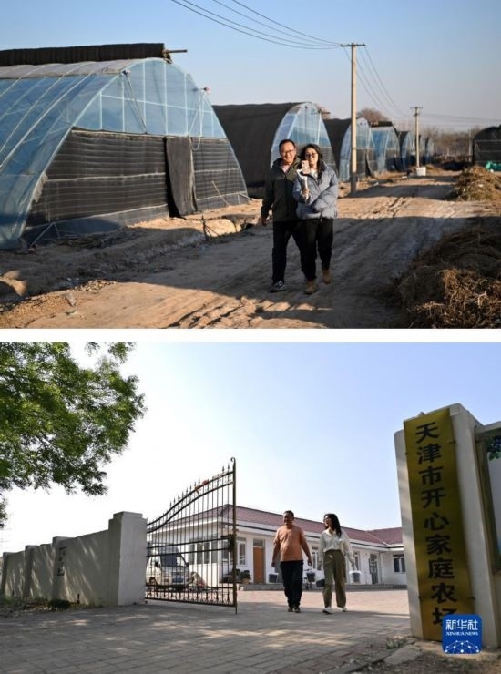 拼版照片:上圖為呂欣和丈夫馮愛喜通過直播介紹自家種植藍莓的大棚(2022年12月6日攝);下圖為呂欣和丈夫馮愛喜一起走出家庭農場(5月3日攝)。