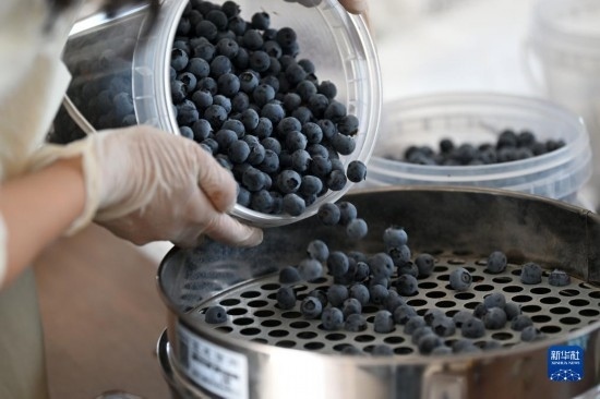 呂欣將剛采摘的藍莓擺放在一起(5月3日攝)。