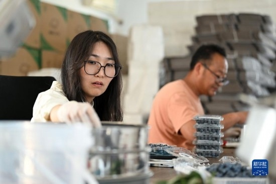 呂欣和丈夫馮愛喜一起包裝剛采摘的藍莓(5月3日攝)。