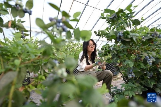 呂欣在大棚內采摘藍莓(5月3日攝)。
