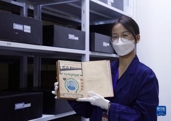 4月28日,在上海市檔案館的珍檔庫(kù)房,保管部工作人員趙競(jìng)舸展示館藏珍檔《青年雜志》創(chuàng)刊號(hào)。