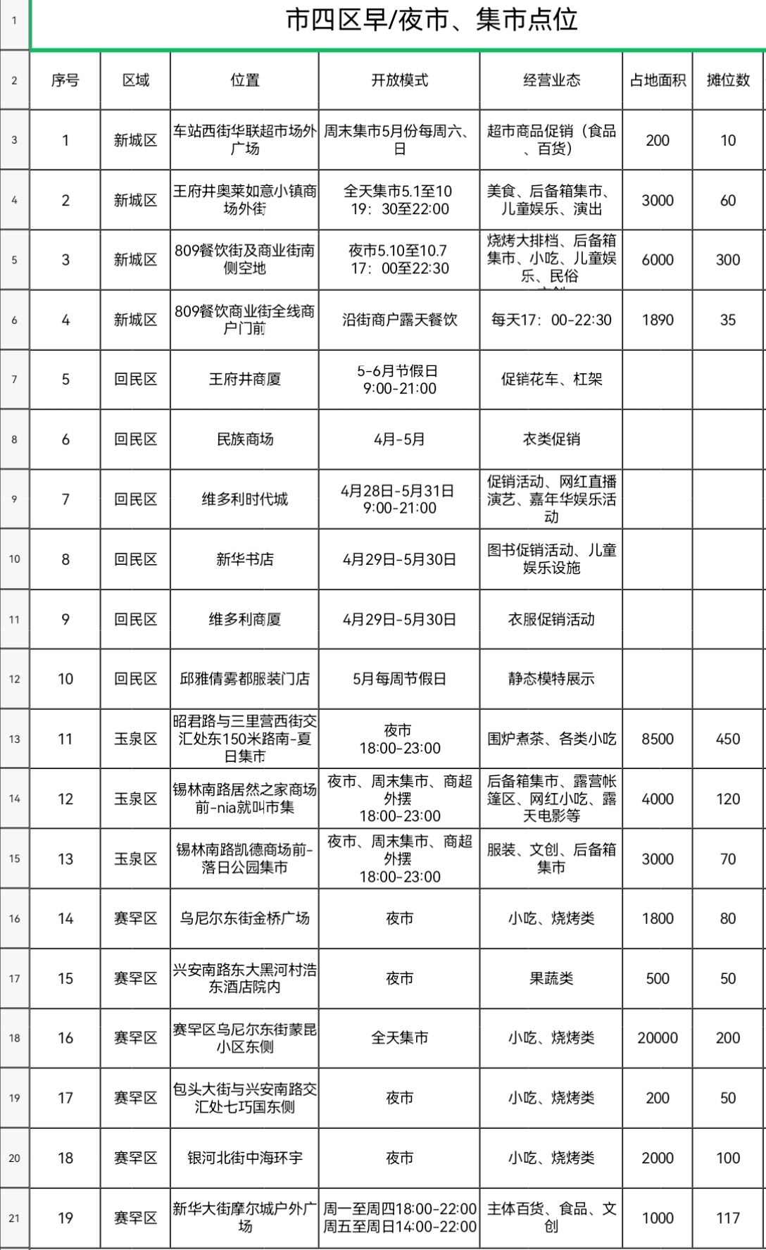 賽罕區(qū)6個(gè),包括烏尼爾東街金橋廣場、興安南路東大黑河村浩東酒店院內(nèi)、賽罕區(qū)烏尼爾東街蒙昆小區(qū)東側(cè)、包頭大街與興安南路交會處七巧國東側(cè)、銀河北街中海環(huán)宇的夜市、全天集市,以及新華大街摩爾城戶外廣場售賣主體百貨、食品、文創(chuàng)的點(diǎn)位。