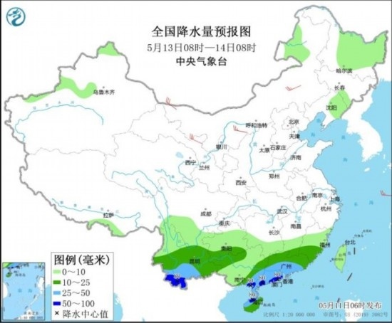 全國降水量預(yù)報圖(5月13日08時-14日08時)