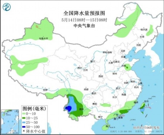 5月14日08時至15日08時,西南地區(qū)南部、廣東東南部、臺灣島大部等地部分地區(qū)有中到大雨,其中,云南西南部等地部分地區(qū)有暴雨(50~70毫米)。新疆北疆北部部分地區(qū)有6~7級風(fēng)。