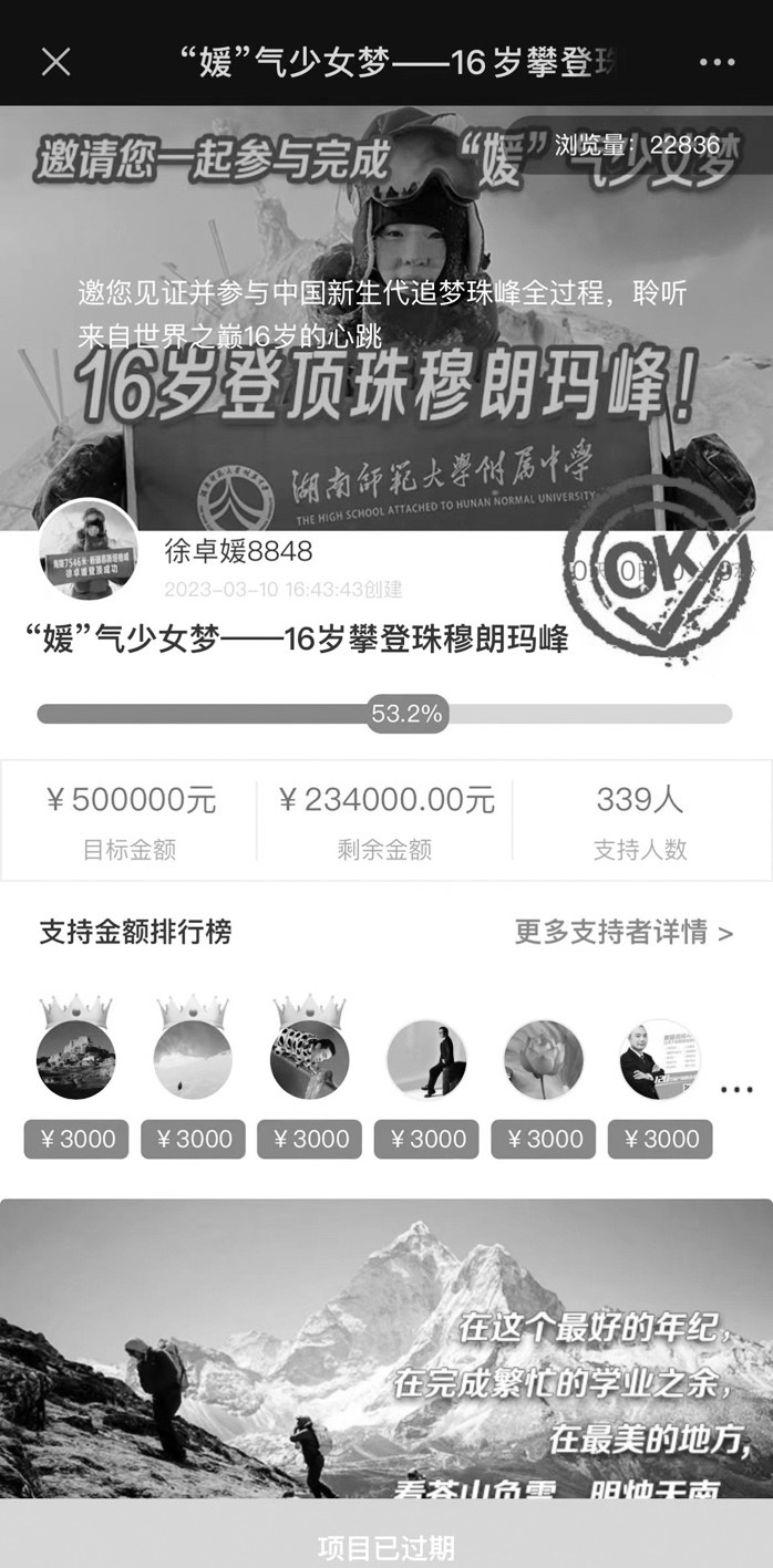 5月15日,揚(yáng)子晚報(bào)紫牛新聞?dòng)浾咴俅吸c(diǎn)開徐卓媛當(dāng)初發(fā)起助力登峰的眾籌鏈接,發(fā)現(xiàn)該項(xiàng)目已過期,籌款進(jìn)度最終定格在53.2%,最終籌集到資金266000元。除去徐江雷朋友們贊助的這二十多萬元,據(jù)了解,還有一些企業(yè)也出資贊助了徐卓媛登頂珠峰的活動(dòng)。徐江雷此前告訴記者,江蘇一家藥企看到此前揚(yáng)子晚報(bào)對(duì)于徐卓媛的報(bào)道后(本報(bào)今年3月17日刊登《眾籌50萬,助16歲女兒挑戰(zhàn)珠峰》一文),被她小小年紀(jì)敢于攀登高峰的精神所打動(dòng),秉承著“少年強(qiáng)則國強(qiáng)”的理念,慷慨贊助徐卓媛登山資金30萬元。