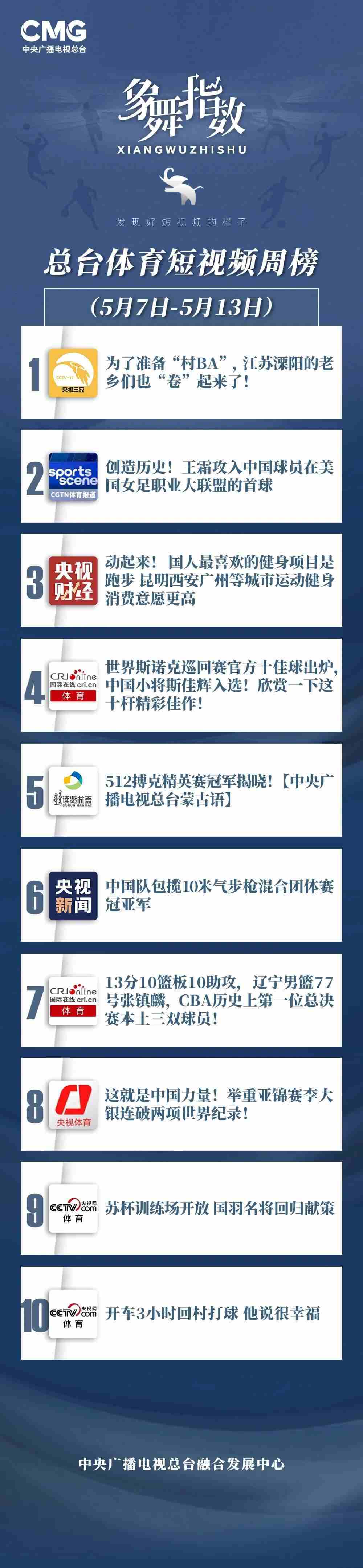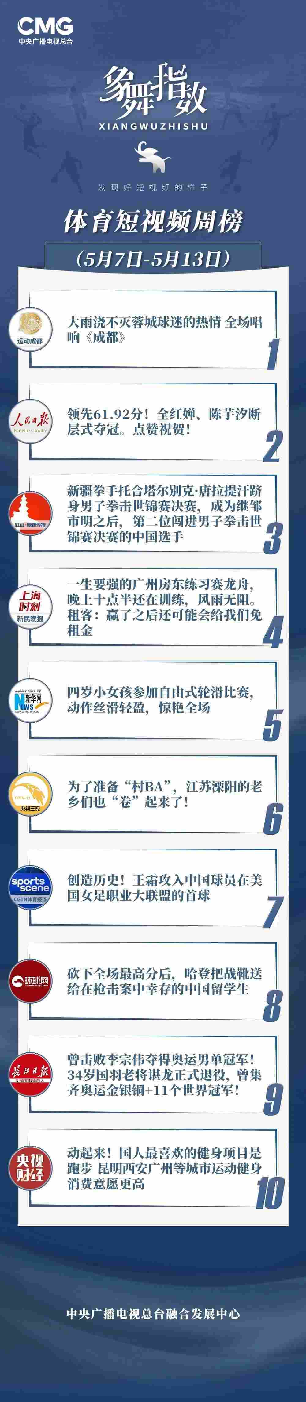 中央廣播電視總臺(tái)“象舞指數(shù)”評(píng)議品牌,推出體育短視頻周榜、總臺(tái)體育短視頻周榜。在5月7日—5月13日,以下內(nèi)容獲得矚目: