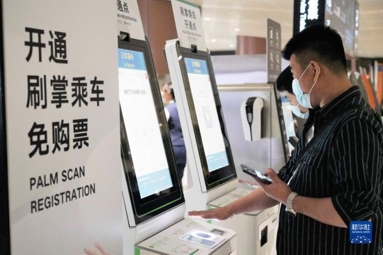 5月21日,乘客在北京大興機場線大興機場站的自助售票機前采集掌紋,開通刷掌乘車服務。