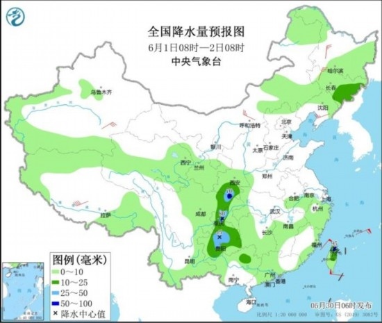 5月31日08時至6月1日08時,陜西中南部、四川盆地東部和南部等地部分地區(qū)有中到大雨,其中,陜西南部、四川盆地東北部、重慶、臺灣島東北部等地部分地區(qū)有暴雨或大暴雨(100~120毫米)。內蒙古、東北地區(qū)、四川盆地東部、浙江、福建沿海、臺灣島等地部分地區(qū)有4~6級風。臺灣以東洋面將有8~9級、陣風10級的偏北風,東海南部、巴士海峽將有7~8級風,陣風9級。
