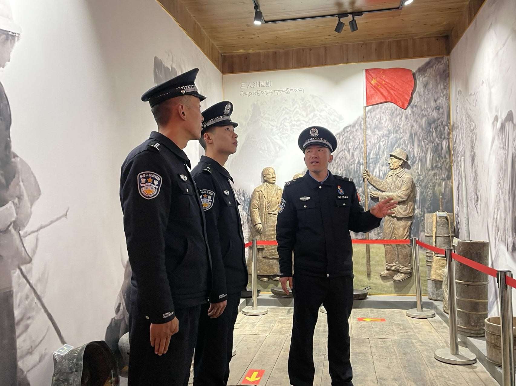 王微(右一)給兩位民警講述戍邊故事。人民網(wǎng) 周靜圓攝