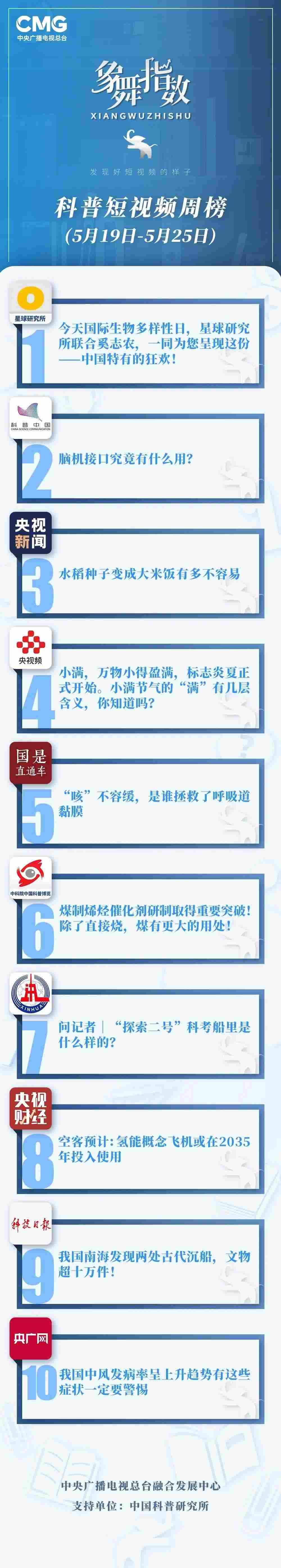 中央廣播電視總臺“象舞指數(shù)”評議品牌,推出科普短視頻周榜、總臺科普短視頻周榜。在2023年5月19日-5月25日,值得注目的內(nèi)容有: