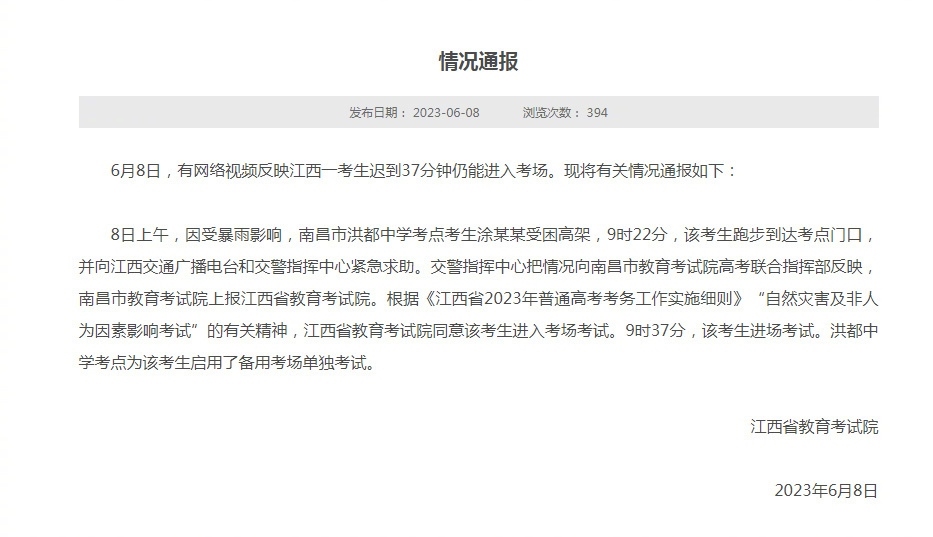 ·江西省教育考試院通報“一考生遲到37分鐘仍能進(jìn)入考場”。