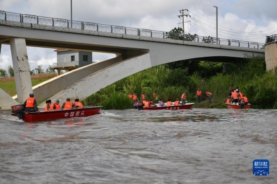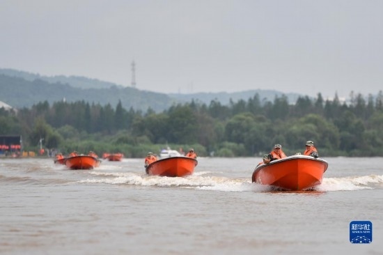 6月26日,防汛搶險應(yīng)急演練人員駕駛沖鋒舟巡邏。