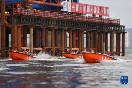 6月26日,防汛搶險應(yīng)急演練人員利用應(yīng)急動力舟橋轉(zhuǎn)移“被困群眾”。