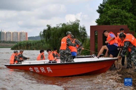 6月26日,防汛搶險應(yīng)急演練人員駕駛沖鋒舟轉(zhuǎn)移“被困群眾”。