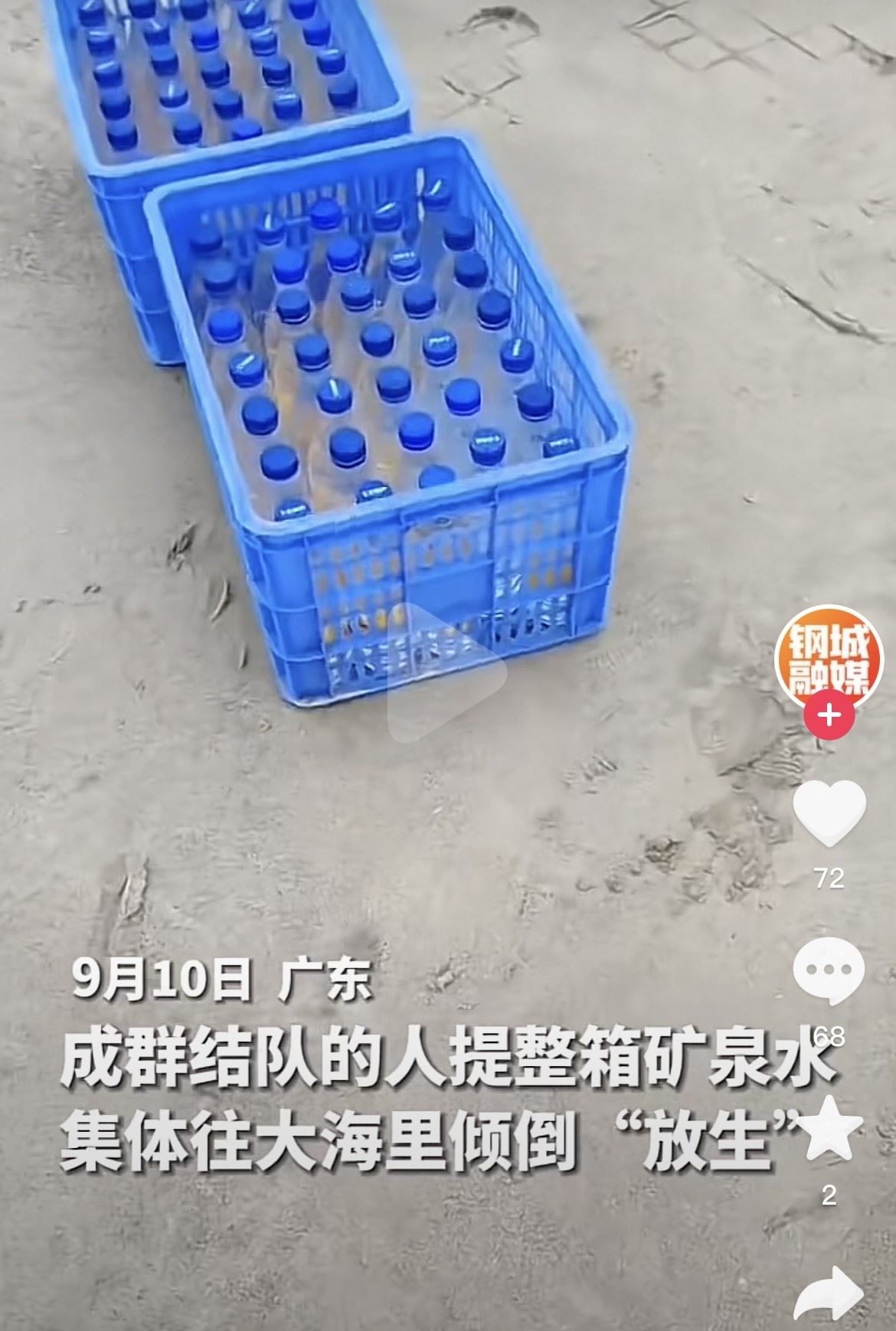 近日,有網(wǎng)友在社交平臺發(fā)布稱,廣東汕尾湖東港有一群人往海里“放生”礦泉水,60多箱礦泉水被浪費。現(xiàn)場視頻顯示,一群人抬著藍色的箱子正往海邊走,箱子里可見擺放整齊的礦泉水瓶。視頻發(fā)布者介紹,9月10日下午3點多來了兩輛大巴,大巴上坐滿了人。