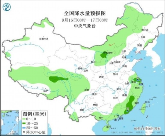 全國降水量預(yù)報(bào)圖(9月16日08時(shí)-17日08時(shí))