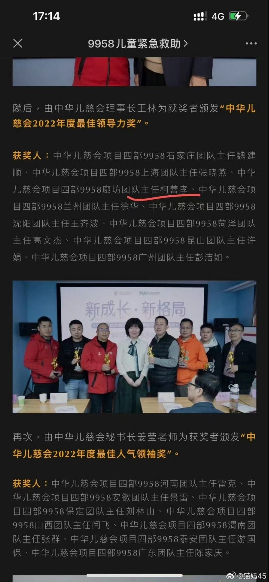 但對這份聲明,被騙家屬們并不認(rèn)同。首先是涉案人員柯某孝的身份問題,此前中華兒慈會官方公眾號顯示,柯某孝為“中華兒慈會項目四部9958廊坊團(tuán)隊主任”,獲“中華兒慈會2022年度最佳領(lǐng)導(dǎo)力獎”。目前,中華兒慈會官方公眾號文章已對這些內(nèi)容進(jìn)行修改或刪除。