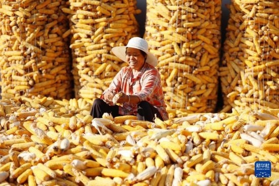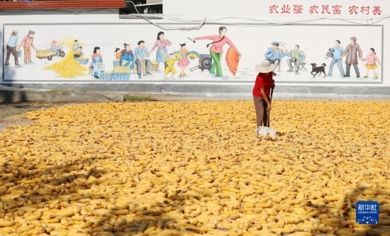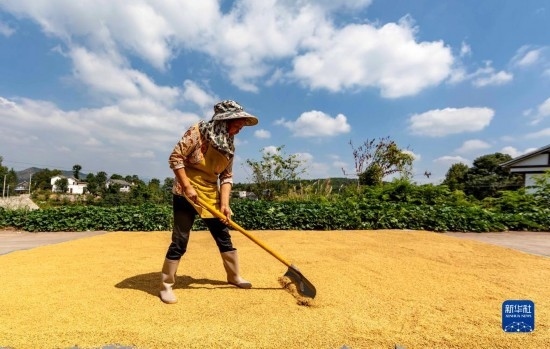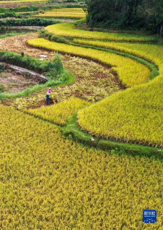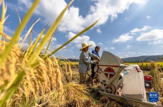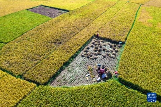 金秋時(shí)節(jié),各地農(nóng)民搶抓晴好天氣忙收獲,田間地頭一派繁忙景象。新華社發(fā)(胡攀學(xué) 攝)
