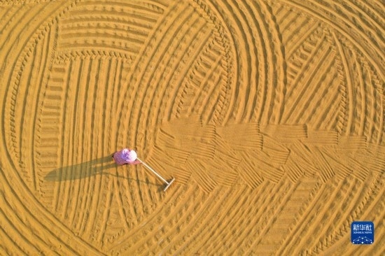 9月14日,河南省寶豐縣龍王溝鄉(xiāng)村振興示范區(qū)的農(nóng)民在晾曬谷子(無(wú)人機(jī)照片)。