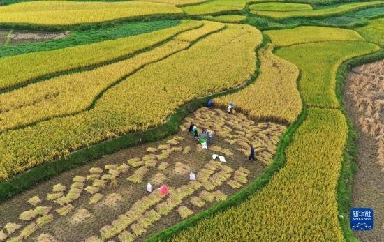 9月14日,湖北省秭歸縣九畹溪鎮(zhèn)石柱村村民在田間收獲稻谷(無(wú)人機(jī)照片)。