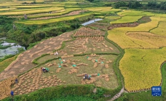 金秋時(shí)節(jié),各地農(nóng)民搶抓晴好天氣忙收獲,田間地頭一派繁忙景象。新華社發(fā)(袁福洪 攝)