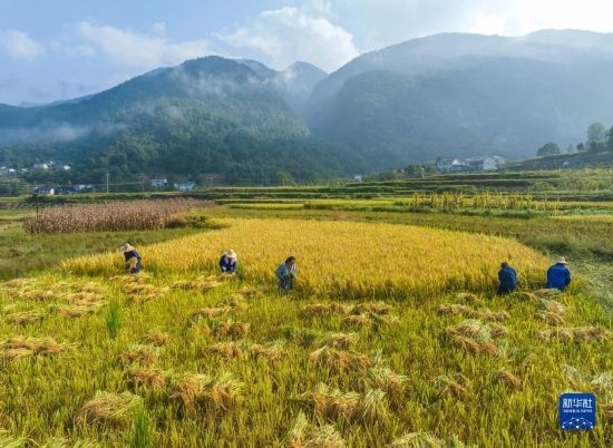 9月14日,重慶市酉陽(yáng)土家族苗族自治縣楠木鄉(xiāng)紅莊村村民在高山稻田里收割水稻。
