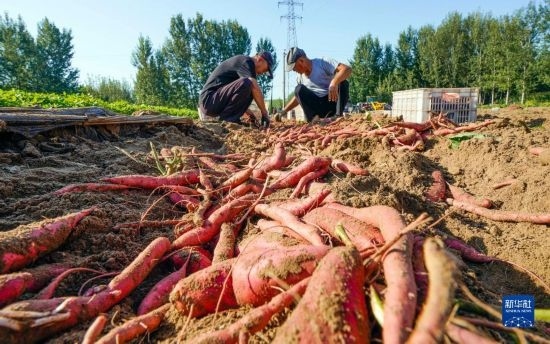 9月14日,河北省唐山市海港經(jīng)濟(jì)開(kāi)發(fā)區(qū)王灘鎮(zhèn)農(nóng)民在田間收獲紅薯。