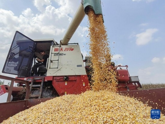 9月14日,農(nóng)民駕駛農(nóng)機(jī)在河南省駐馬店市汝南縣羅店鎮(zhèn)袁莊村收獲成熟的玉米。