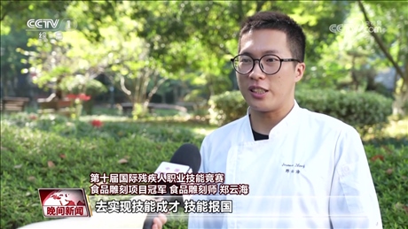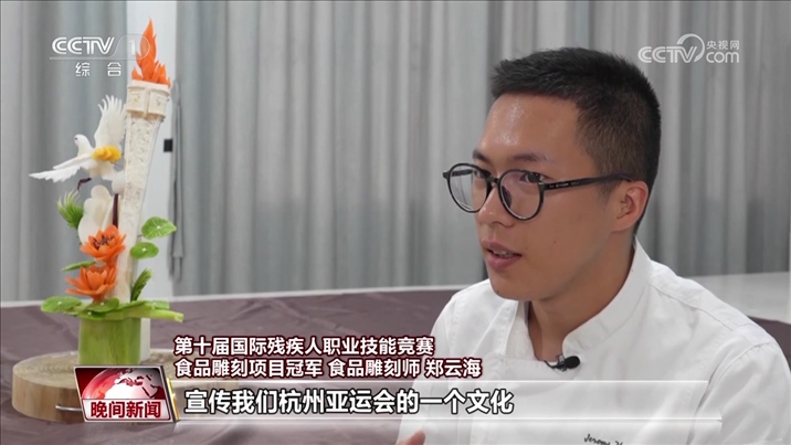 第十屆國際殘疾人職業(yè)技能競賽食品雕刻項(xiàng)目冠軍 食品雕刻師 鄭云海:最近有火炬(傳遞),寓意就是美好、和平,還有吉祥。我想用自己的技能去宣傳我們杭州亞運(yùn)會的一個(gè)文化。