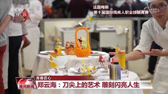 功夫不負(fù)有心人,鄭云海的雕刻技藝不斷精進(jìn),他也開始自主設(shè)計(jì)創(chuàng)作作品,并斬獲了多項(xiàng)國內(nèi)比賽冠軍。今年3月,在法國梅斯舉辦的第十屆國際殘疾人職業(yè)技能競賽食品雕刻項(xiàng)目比賽中,他奪得金牌,成為食品雕刻屆的世界冠軍。