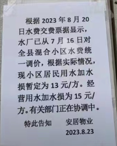 上述網(wǎng)民在《民生熱線》上投訴:“白水縣全縣小區(qū)水費上調(diào),最少的12.6元/方,還有15元/方,以前需7元/方,為什么翻倍漲價?”同時,該網(wǎng)民還列出兩張自來水價格調(diào)整的通知。