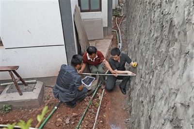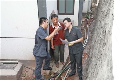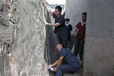 執(zhí)行干警確認(rèn)石磡墻高度。