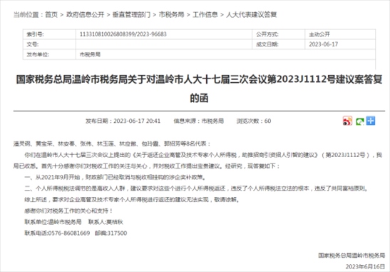 ·浙江溫嶺多位代表委員建議返還企業(yè)高管個稅,當地財稅部門回應:違反共同富裕原則。