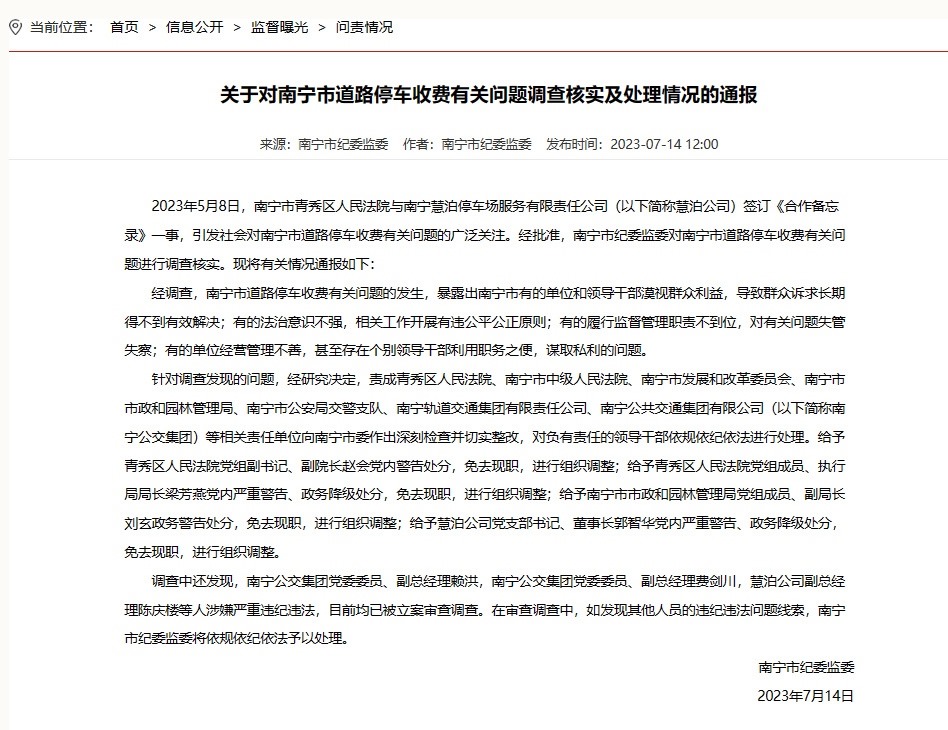 ·南寧通報(bào)道路停車收費(fèi)有關(guān)問(wèn)題處理情況:4人被免職。