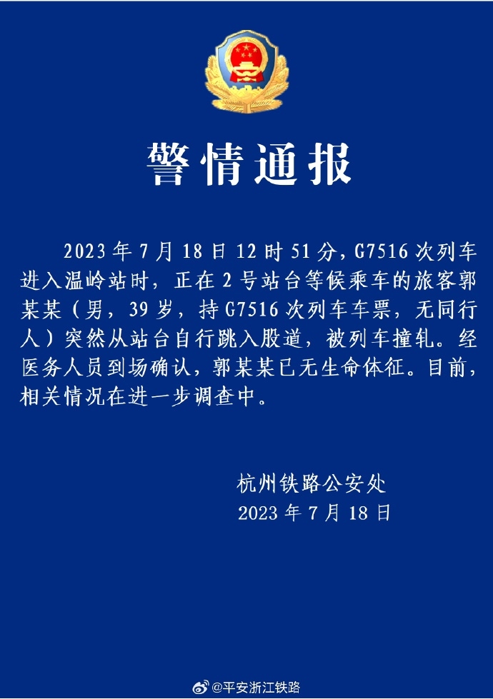 ·警方通報:溫嶺跳下高鐵站臺男子已無生命體征。