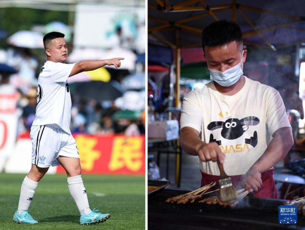 貴州“村超”球員的“雙面人生”。左圖為7月15日,六佰塘村足球隊球員楊宗維在比賽中組織進攻;右圖為7月16日,楊宗維在燒烤攤給客人烤肉串。