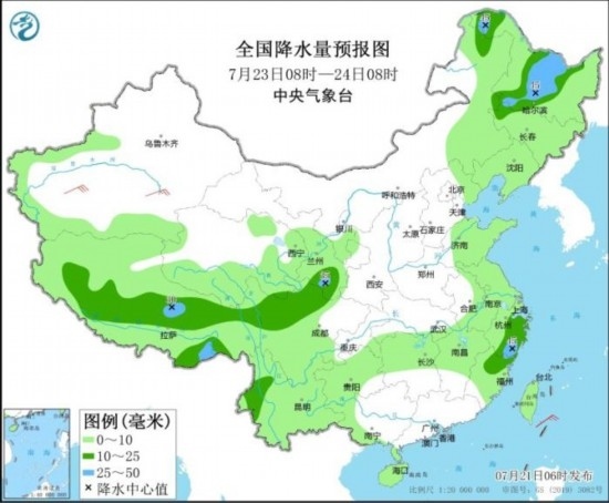 圖4 全國(guó)降水量預(yù)報(bào)圖(7月23日08時(shí)-24日08時(shí))