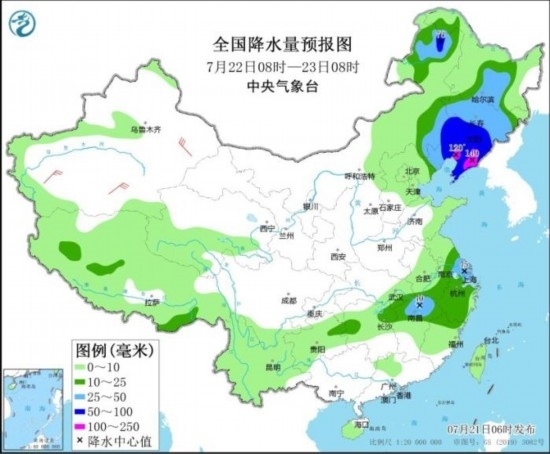 7月22日08時(shí)至23日08時(shí),內(nèi)蒙古東部、東北地區(qū)大部、江淮東部、江南東北部等地部分地區(qū)有中到大雨,其中,內(nèi)蒙古東南部、吉林南部、遼寧大部等地部分地區(qū)有暴雨或大暴雨(100~140毫米)。新疆南疆盆地和東部等地部分地區(qū)有4~6級(jí)風(fēng)(見(jiàn)圖3)。