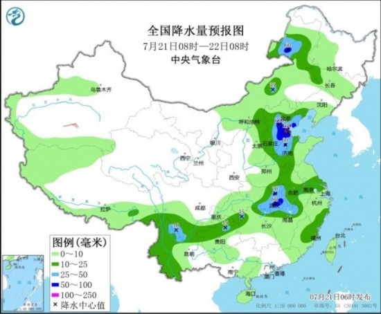 預(yù)計(jì),7月21日08時(shí)至22日08時(shí),內(nèi)蒙古東北部、河北東部、北京、天津、山東西北部、河南東南部、湖北東部、江西北部、四川南部等地部分地區(qū)有大到暴雨,其中,河北中部、北京東南部、天津南部等地局地有大暴雨(100~130毫米)。上述部分地區(qū)伴有短時(shí)強(qiáng)降水(最大小時(shí)降雨量20~50毫米,局地可超過(guò)60毫米),局地有雷暴大風(fēng)等強(qiáng)對(duì)流天氣。中央氣象臺(tái)7月21日06時(shí)繼續(xù)發(fā)布暴雨藍(lán)色預(yù)警。