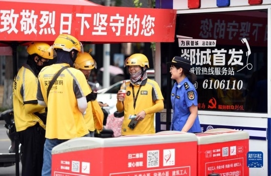 7月21日,在山東省臨沂市郯城縣“愛心驛站”,城管隊(duì)員為外賣小哥送上冰鎮(zhèn)水。新華社發(fā)(房德華 攝)