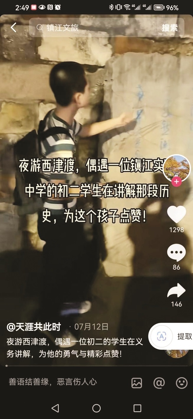 揚(yáng)子晚報(bào)訊(記者 萬凌云 通訊員 湯婉蓉 孫冬)“人類的歷史與功績(jī)會(huì)隨著時(shí)間而消失。但是中國將在他們身上繼續(xù)存在,我們將保持他們高舉的旗幟……”7月22日,一段鎮(zhèn)江初中學(xué)生講解歷史的視頻爆火,他們的講解地位于歷史底蘊(yùn)深厚的鎮(zhèn)江西津渡景區(qū)。