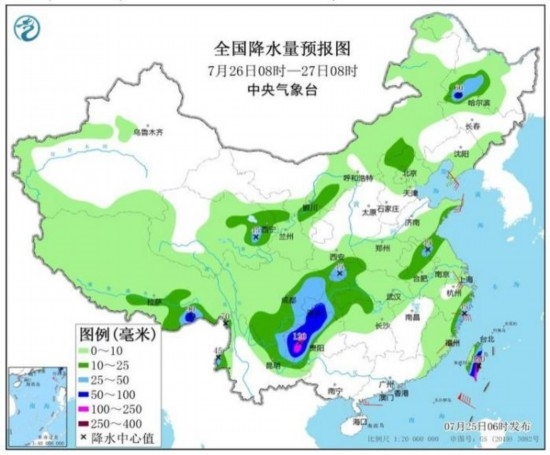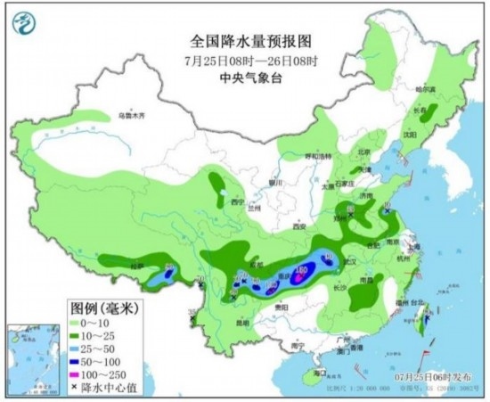 預(yù)計,7月25日08時至26日08時,重慶中南部、四川南部、云南東北部、貴州北部、湖南西北部、湖北西部以及江蘇北部、西藏東南部、臺灣島東部等地的部分地區(qū)有大到暴雨,其中,重慶東南部、四川南部、貴州北部等地局地有大暴雨(100~150毫米)(見圖1);上述部分地區(qū)伴有短時強降水(最大小時降雨量20~50毫米,局地可超過70毫米),局地有雷暴大風(fēng)等強對流天氣。中央氣象臺7月25日06時繼續(xù)發(fā)布暴雨藍色預(yù)警。