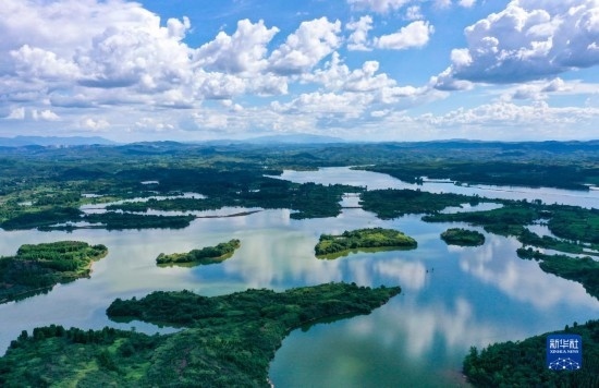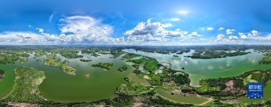 8月6日,湖南桂陽舂陵國家濕地公園,綠水、濕地、藍天相映成趣,構成一幅秀美的夏日生態(tài)畫卷(無人機全景照片)。
