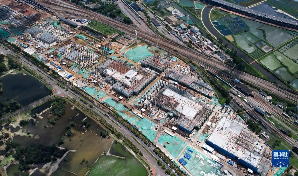 ??谛潞8酆湍细邸岸€口岸”(貨運(yùn))集中查驗(yàn)場所建設(shè)項(xiàng)目(7月21日攝,無人機(jī)照片)。