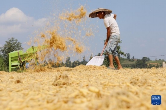 8月11日,在湖南省婁底市雙峰縣石牛鄉(xiāng)常漢村,農民在晾曬稻谷。